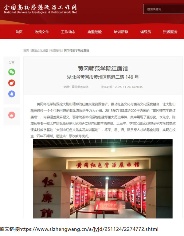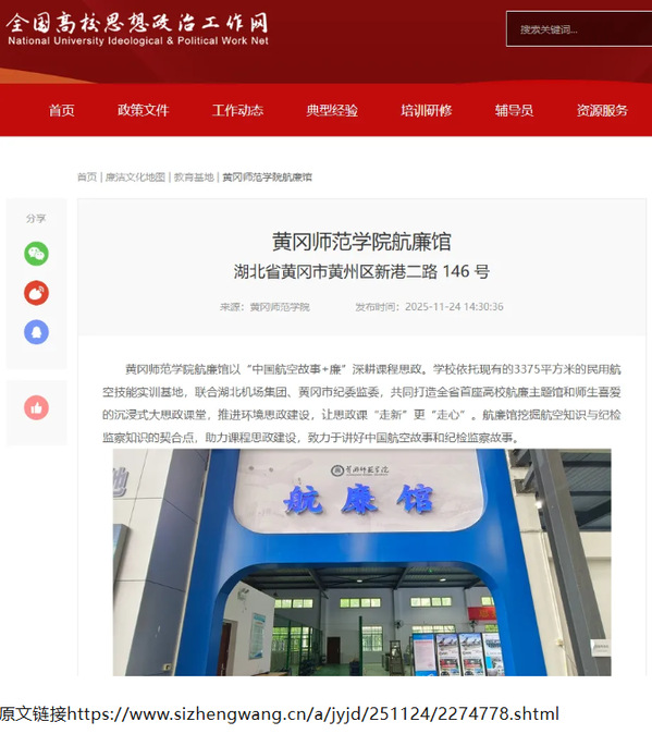 近日,教育部通过全国高校思想政治工作网展播全国高校廉洁文化地图,黄冈师范学院航廉馆、红廉馆入选全国高校廉洁文化地图库教育基地板块。
